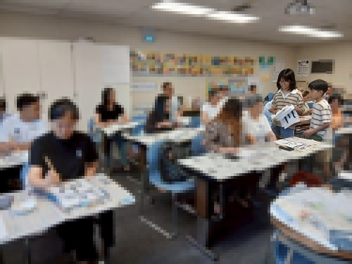 奥さんがインスタ経由で突撃連絡した結果、移民許可のために通うアダルトスクールを訪問できることに。校長先生がとても親切な方で、学校案内だけじゃなく「文化交流もやろうよ」と、習字体験の場を用意してくれました。
